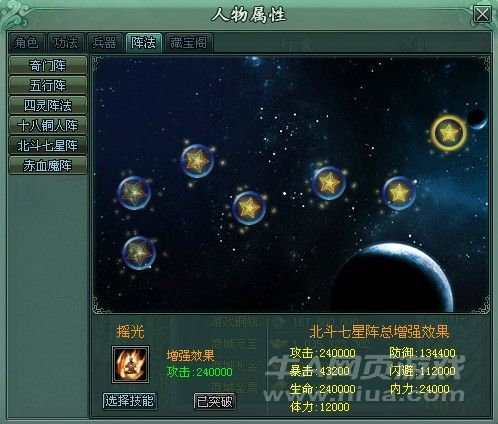 北斗七星阵分别为,天枢、天璇、天玑、天权、玉衡、开阳、摇光七个星阵。每突破一个星阵后,即可选择需要增强的自身属性。
