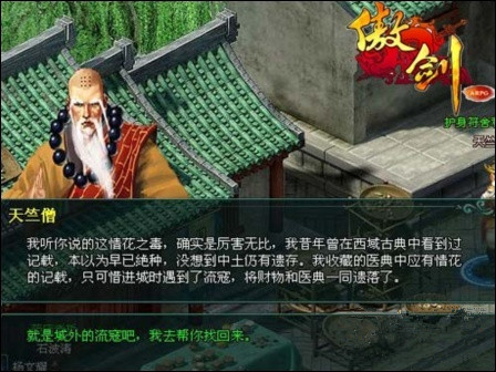 天竺僧是找到了,可是问题也随之而来。天竺僧进城之时在城外遭到了流寇的袭击,记载着情花之毒的医典也在袭击中遗落。为了取回医典,玩家接过了对抗流寇的任务。在出城之前,准备好相应的药品是比不可少的,襄阳城外可是宋蒙两国交战的战场。