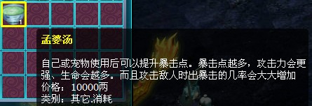 然而在《仙域》世界里玩家或者宠物使用孟婆汤后可以提升暴击点。暴击点越多,攻击力会更强、生命会越多。而且攻击敌人时出暴击的几率会大大增加。随着玩家人物的属性提高,孟婆汤所带来的好处是玩家不可想象的。 .jpg)