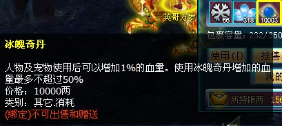 冰魄奇丹是雪山地图开放以后新增的补血特效丹药,人物及宠物使用后可以增加1%的血量,使用冰魄奇丹增加的血量最多不超过50%。也就是说玩家如果基础好,血量够多,那么提升的就越多。所以玩家要好好利用冰魄奇丹,不可浪费的绝佳高级丹药。 .jpg)