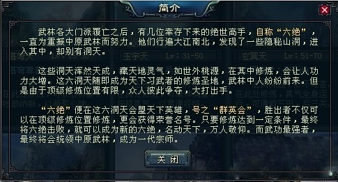 群英会这个传说是天下英雄聚集论剑之地,吸引各门派,各路英雄聚集于此,其中不乏顶绝的高手,此地号称“六绝”,分别为苍穹天、玉宇天、玄冥天、碧落天、紫微天、神武天。每“绝”都会有顶绝高手在此守护。作为高手之一的玩家,除了休闲之外,养心也是个好去处。