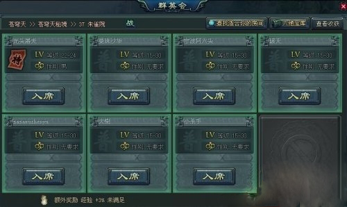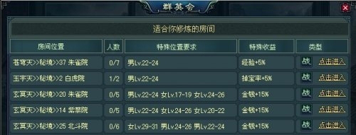 点击“查找合适你的房间”,点击进去之后,看到的任意一个只要是显示在玩家面前的房间,都可以进入。注意一下这里有一个“特殊收益”,里面有些选项。在这点上,十年一剑的设置很人性化,有三种 如上图所示,有收获经验、掉宝、收获金钱,具体看玩家需要什么。