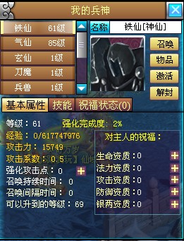 兵神初始为1级,召唤出来后与法宝、宠物、坐骑一样分享人物的经验,到60级时必须使用轮回转盘轮回后才能继续升级到封顶等级。兵神每到一定的等级要进行解封才可以继续升级,解封需要使用兵神之气。兵神的等级每提升一级,相应的攻击力都会有所增加。下面给大家详细解说一下兵神解封的方法: