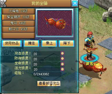 大海龟:在注册进入游戏后,一路跟着主线任务飞速成长之后,不经意的接到了主线任务中,拯救雪儿的任务时,在完成一系列的前缀任务完成后,会让你去寻找仙人与之对话,这时将可接受到大海龟的骑宠任务,埋头苦干吧,最后一个环节出发寻找 狐媚娘这小妖精,此妖位于绕云镇右上方的单人FB内,进去不要客气推倒她,获取她的“妖狐内丹”,就可以返回接受任务NPC处提交任务,大海龟将成为你的第一个坐骑。 .jpg)