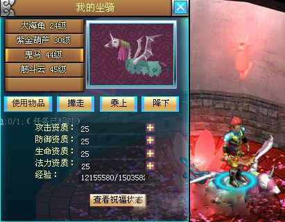 鬼马:神马是浮云,而鬼马可不是浮云,当你达到40级别时候主线任务继续跟着脚步走。首先去鹤鸣山找鲁木匠接任务,一些琐屑完成之后,又叫你去忘情河杀飞鱼怪取一根飞鱼须交给他,完了鲁木匠会要求你支付5000两银子(原来鲁班大师也非圣贤啊!要拿他的手工品还得付钱,且还不便宜)鲁木匠又要你去杀鬼马得张鬼马皮交给他(他要开工了,工资付了材料还得咱自己搞,黑暗啊~~)不过最终咱也就获得了传说中的鬼马坐骑了!