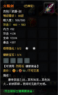 90级剑系侠客专用武器火精剑:相传是唐帝李适之剑,其形如龙,其色如火,斩铁即碎,夜间可见数尺光明。唐帝李适是一个在历史上评述极为极端的一位帝王,前半生励精图治、后半生却昏庸不堪,由此而起,大唐盛世真正走向没落式微。