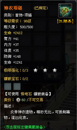 极高的属性,臂力、内力、体质三围都有增加,气血生命增加也超过3500点,这种极品项链也只有堂堂三皇之一的神农才能拿的出来,得此链者,实力必然大大增强。