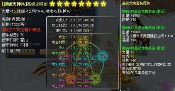兵器的金属性可以提升玩家的力量、木可以提升玩家的体质、水可以提升玩家五行、悟性可以提升玩家的福缘、土可以提升玩家的防护。以上提升的值不会具体显示在玩家属性栏,但会产生世纪效果。