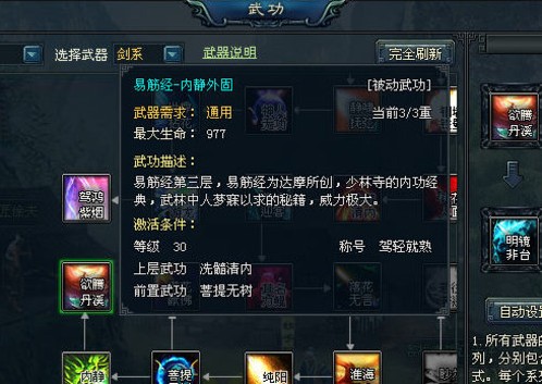 除了运用各种武器的精妙招法,牛A十年一剑中还有七大辅助功法供你修习。这七大功法无一不是江湖中赫赫有名的绝学,分别是:易筋经、小无相功、凌波微步、北冥神功、九阳神功、先天功、龙象波若功。这些辅助功法,能提高角色的生命值、闪避、攻击、防御、攻速、暴击、命中等多项战斗属性,让你在战斗中更具优势。