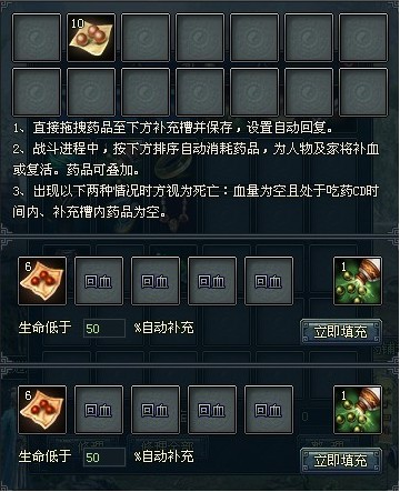 在战斗过程中,当人物血量为空且处于吃药冷却时间内,人物将死亡。因此战斗前,要事先做好充分的补血工作,将药品拖至下方补充槽中,设置自动补充的生命值百分比,保存完成后,在战斗进程中会按药品排序自动补血或复活。 .jpg)