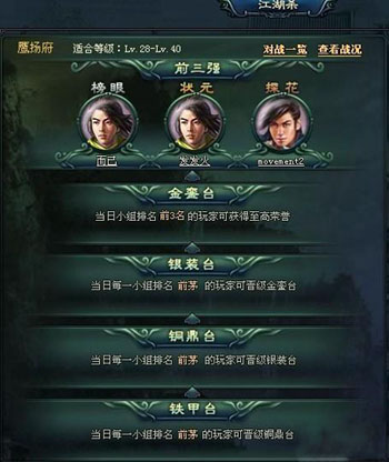 江湖杀:这个是新推出的竞技场模式的玩家切磋的方式之一,每周只有幸运星排行前325名内的高手才能角逐,经过一周的厮杀,每周出决出一名“武林盟主”。这个可是有点难度的,毕竟角逐于此的人,都不是简单的一刀就可以秒杀的,一个不小心或者实力上存在差距的人,很快就会出局。