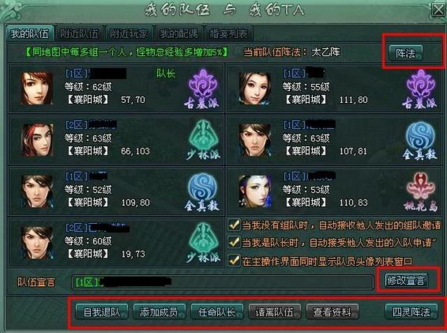 在组队界面最下方,可以看到自我退队、添加成员、任命队长、请离队伍和查看资料。当玩家自己为队长时可以实行以上五种职权。同时队长还可以修改队伍的宣言,以便吸引更多玩家前来组队。当玩家为队友时可以实行自我退队和查看资料两种职权。