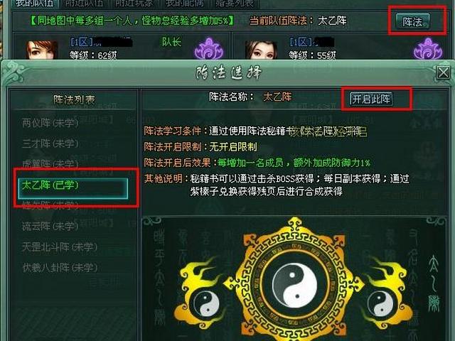 队伍中如果有人学习过阵法,还可以开启阵法的使用。阵法开启后将会有此阵法独特的一些加成,包括增长血量、体力等上限,加成攻击力、暴击、防御,移动速度等。全组成员在同一地图均可收益。