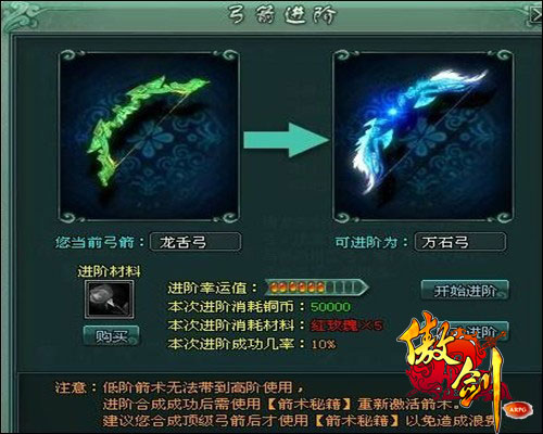 在火器诞生之前,任何青铜或钢铁的武器都不能与弓箭相比。作为重要的远程攻击武器,在牛A《傲剑》的世界中,也是无数玩家最佳配备。《傲剑》世界中的弓箭武器有龙舌弓,游子弓,万石弓等7把。造型酷炫的它们不仅威力巨大,还将能够提升玩家的各种属性,增强玩家的实力,给予玩家最畅快的格斗体验。值得一提的是,没把弓箭只需通过不断的进阶,就能提升器品质,发挥出更为强大的实力。