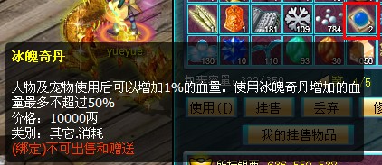 冰魄奇丹是雪山地图开放以后新增的补血特效丹药,人物及宠物使用后可以增加1%的血量,使用冰魄奇丹增加的血量最多不超过50%。