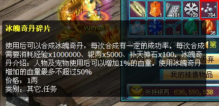 当人物等级达到65级以上时,打怪物有一定的几率掉落冰魄奇丹碎片,使用冰魄奇丹碎片可以合成冰魄奇丹,每次合成需要消耗经验x1000000、银两x5000、补天神石x100。玩家在“我的物品”界面直接使用“冰魄奇丹碎片”即可进行合成。