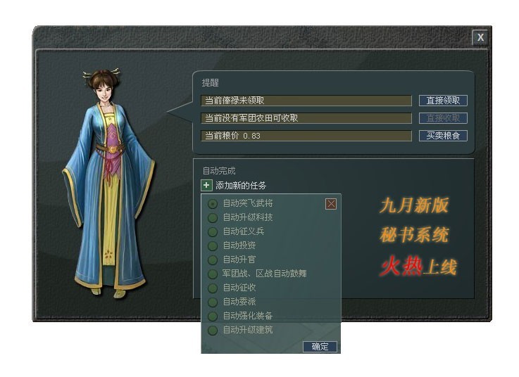 小秘书的主要功能共有两项:自动完成与提醒。包括自动征收、自动强化装备、自动突飞武将、商店买兵符、自动委派等。只需玩家提前添加任务,小秘书都将按时帮您完成,省心省力。