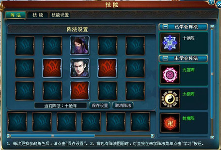 当玩家等级达到20级以上,即可学习第一个阵法--十绝阵。通过排位布阵,选择最合适的阵型,将最合适的人放在最合适的位置上,即可一起和散修以某个阵型与敌人作战,在未学阵法前,玩家的攻防不能结合,战斗也只是单调的肉搏,阵法系统无疑为玩家带来了多样的玩法和无限的乐趣。学习阵法需要阵法图册,阵法图册可通过收集打败副本BOSS掉落的阵法残卷找各国主城的飞云阁海外散仙合成。